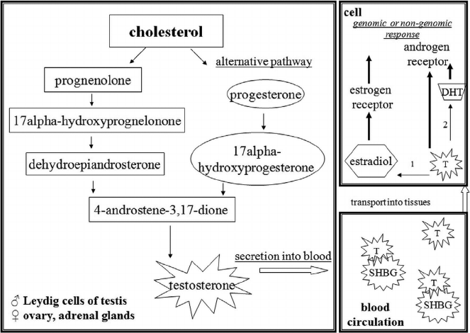 สารตั้งต้นสำคัญที่ร่างกายใช้ในการสังเคราะห์เทสโทสเตอโรนคือ โคเลสเตอรอล (Cholesterol) ที่ได้รับมาจากไขมันไม่อิ่มตัว(Unsaturated Fatty Acid) ซึ่งเป็นไขมันชนิดหนึ่งที่จำเป็นต่อกระบวนการสร้างฮอร์โมนสเตียรอยด์ต่างๆ ในร่างกาย โคเลสเตอรอลจะถูกเปลี่ยนไปเป็น Pregnenolone และ DHEA (Dehydroepiandrosterone) ซึ่งเป็นสารตั้งต้นลำดับต่อไป ก่อนที่จะถูกเปลี่ยนเป็นเทสโทสเตอโรนในที่สุด กระบวนการนี้อยู่ภายใต้การควบคุมของฮอร์โมนจากต่อมใต้สมอง (Pituitary Gland) เช่น Luteinizing Hormone (LH) และ Follicle-Stimulating Hormone (FSH) ซึ่งส่งผลต่อการทำงานของอัณฑะและรังไข่ ซึ่งสามารถเปลี่ยนรูป (Aromatization) เป็น Estrogen หรือฮอร์โมนเพศหญิงได้หากมีมากเกินไปหรือเกิดความผิดปกติในร่างกาย