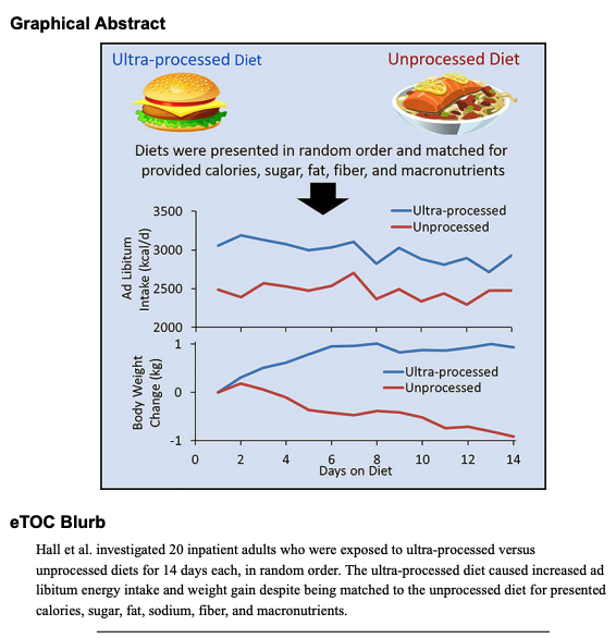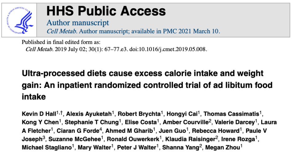 งานวิจัยนี้เป็นการหาคำตอบและข้อสรุปได้ว่า “การกินอาหารที่ผ่านกระบวนการมาก ๆ หรือพวกอาหาร ultra-processed food เป็นตัวการที่ทำให้น้ำหนักตัวเพิ่ม/ไขมันในร่างกายเพิ่มได้” เพราะด้วยคุณสมบัติของอาหารเหล่านี้เอง ทำให้ผู้กินอาจไม่ได้รู้สึกอิ่ม หรือรู้สึกพึงพอใจเท่าที่ควร จึงทำให้กินได้มากขึ้น และได้รับพลังงานรวมเฉลี่ยสูงขึ้น เมื่อเปรียบเทียบกับอาหารที่ผ่านกระบวนการน้อย สำหรับผู้ที่จะเริ่มต้นลดน้ำหนัก จึงควรหลีกเลี่ยงการรับประทานอาหารผ่านกระบวนการมาก ๆ หรือ Fast food ก่อน เพราะกินแล้วอาจทำให้ไม่รู้สึกอิ่ม อาจทำให้สั่งหรือซื้อมากเกินไป ส่งผลให้ได้รับพลังงานมากเกินไปและลดน้ำหนักได้ยากในที่สุด